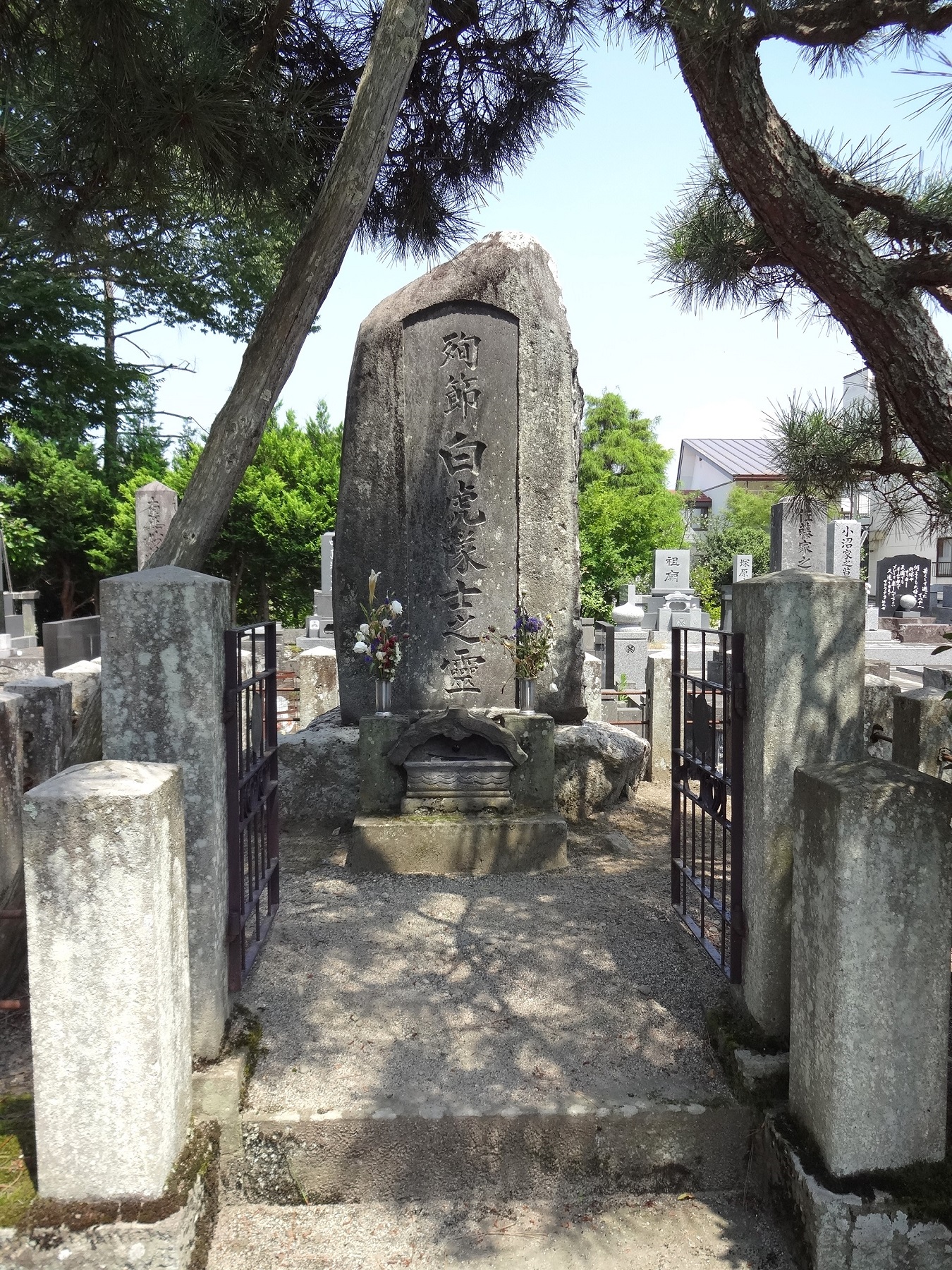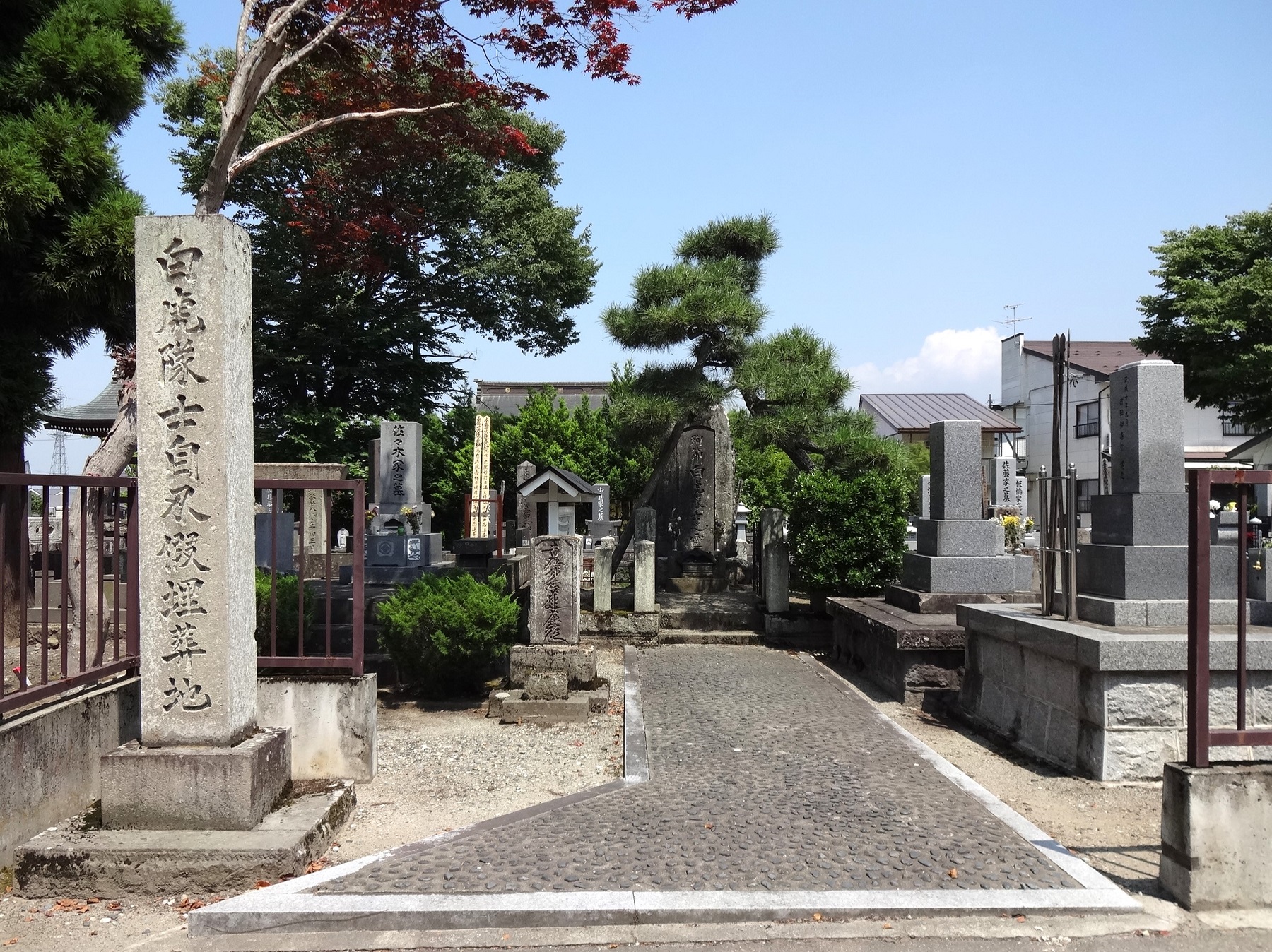「慶応4年8月23日、大野ヶ原に出陣した白虎隊士中二番隊明け方からの激しい戦闘で負傷者が続出した。 味方の必死の攻撃にもかかわらず敵の進攻はやまない。やむを得ずお城を目指して退却することとなり、山中をさまよいながら、ようやく飯盛山上にたどりついた。 しまし、白虎隊士20名の見たものは燃えさかる天守閣であった。 「もはや、これまで、君公も自刃し果てなられたであろう。敵の恥ずかしめを受けるよりは、いさぎよく自刃しよう。」と衆議一決、山上の露と消えた。 白虎隊士の遺体は誰も手をふれることが出来ず、野ざらしの状態であった。 牛ヶ墓の吉田伊惣治は余りにも可哀そうに思い、夜な夜な遺体を菩提寺の墓地に運び埋葬したのである。 よって当山は白虎隊士最初の埋葬地である。」