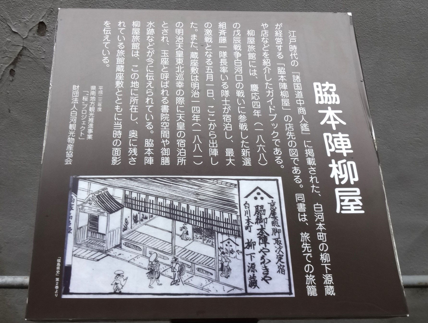 「柳屋旅館には、慶応4年(1868)の戊辰戦争白河口の戦いに参戦した新選組斉藤一隊長率いる隊士が宿泊し、最大の激戦となる5月1日、ここから出陣した。また、蔵座敷は明治14年(1881)の明治天皇東北巡幸の際に天皇の宿泊所とされ、玉座と呼ばれる書院空間や御膳水跡などが今に伝えられている。脇本陣柳屋旅館は、この地に所在し、奥に残されている旅館蔵座敷とともに当時の面影を伝えている。」(抜粋)