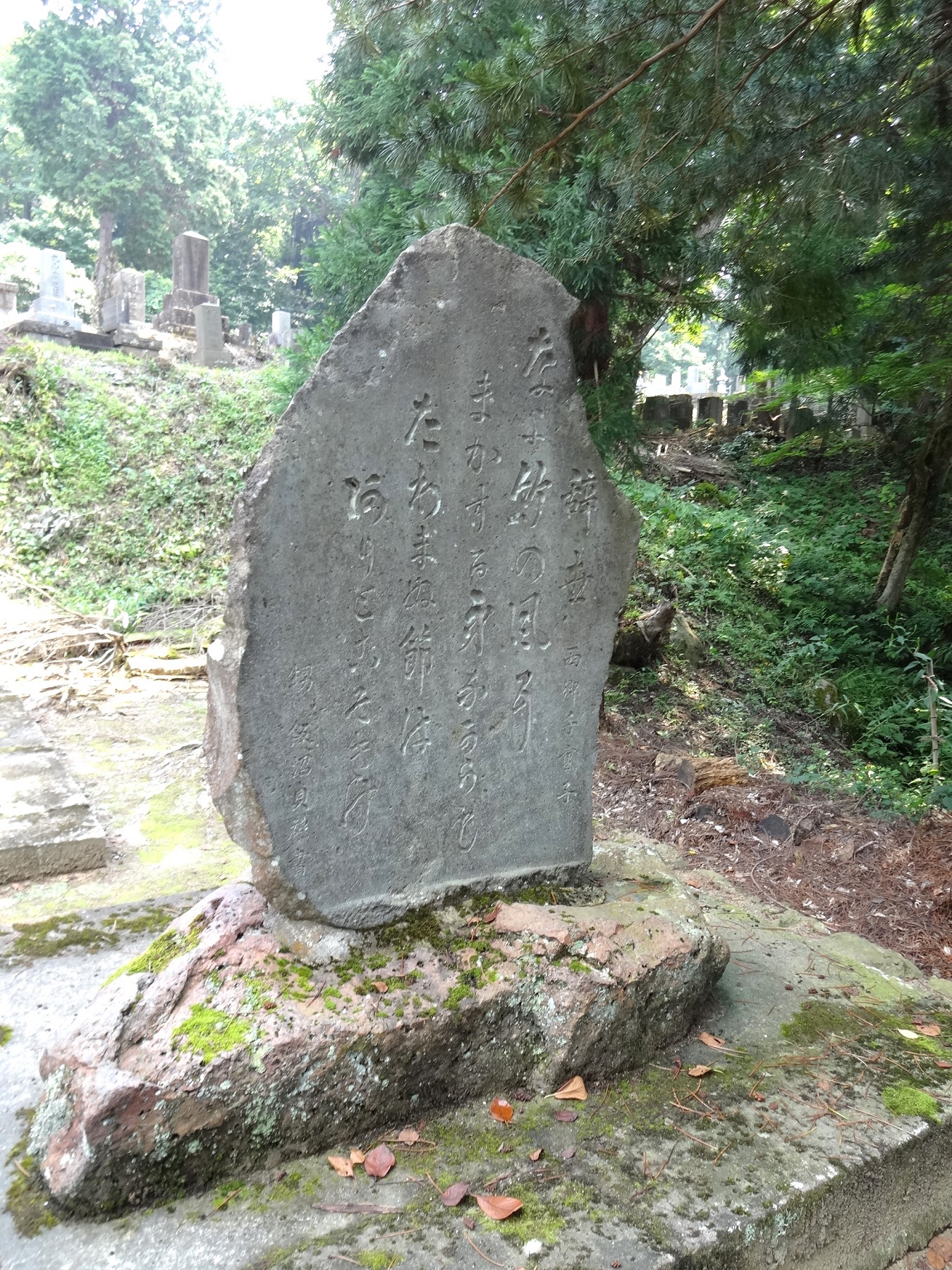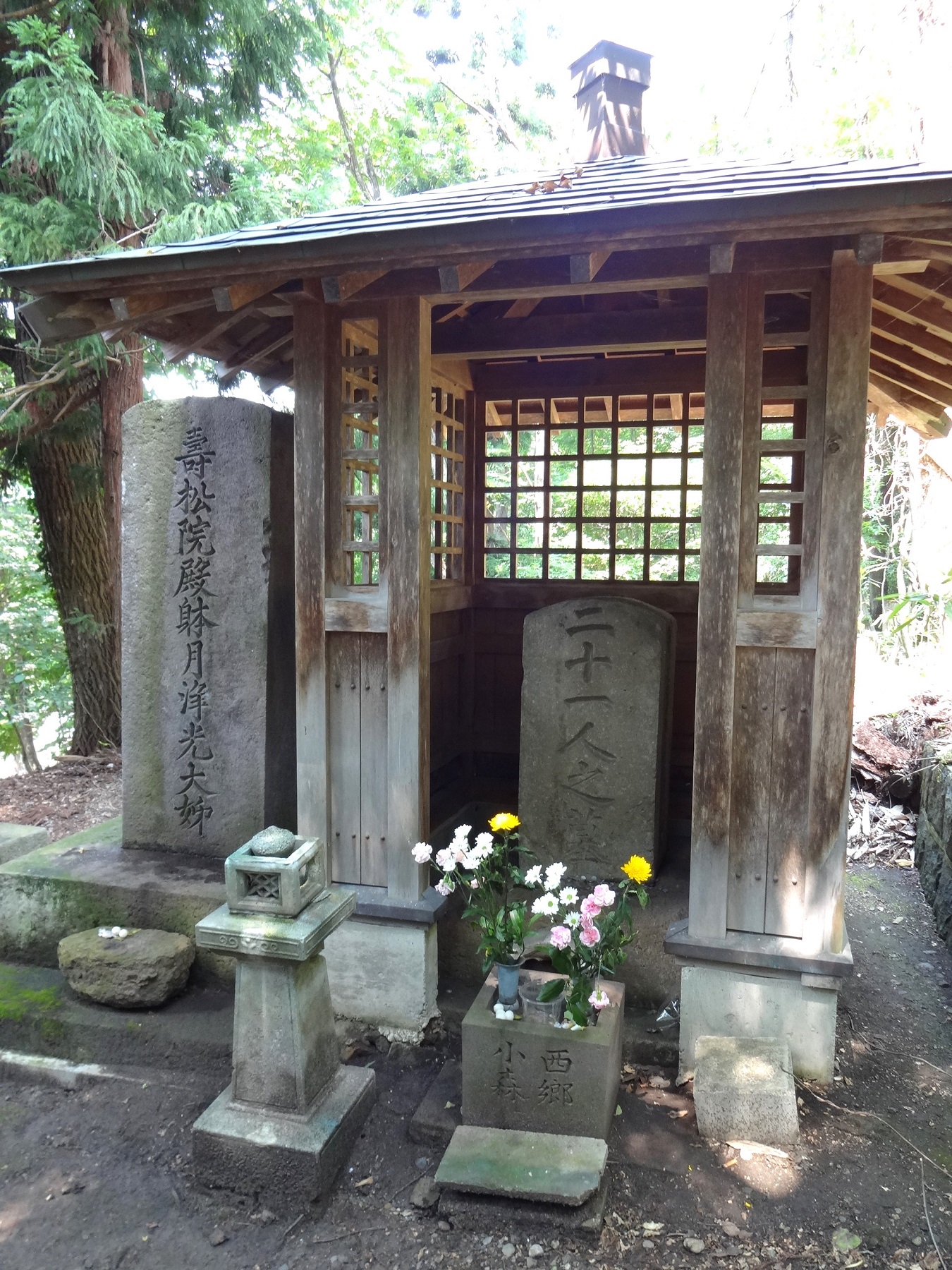 会津戦争の籠城戦の際、足手纏いになると城に入ることを拒否して自刃した、家老・西郷頼母の妻・千重子の辞世の句、“なよたけの 風にまかする身ながらも たわまぬ節はありとこそきけ”、の句碑が建立されている。