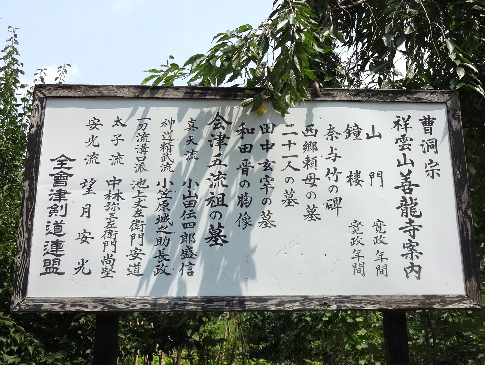 保科家(後に松平家に改姓)の菩提寺。会津藩家老・西郷頼母夫妻の墓、二十一人の墓、高木盛之輔の墓などがある。