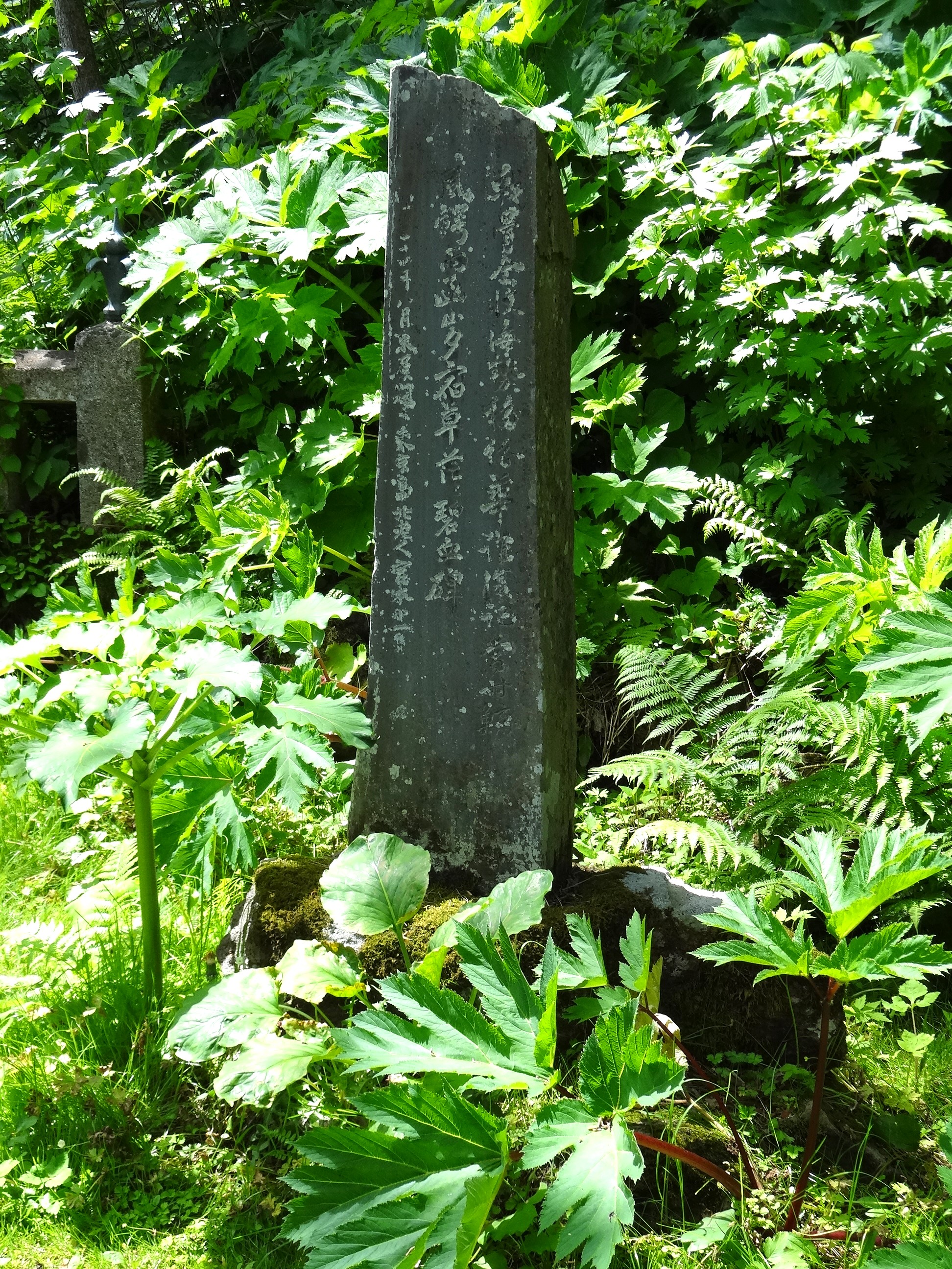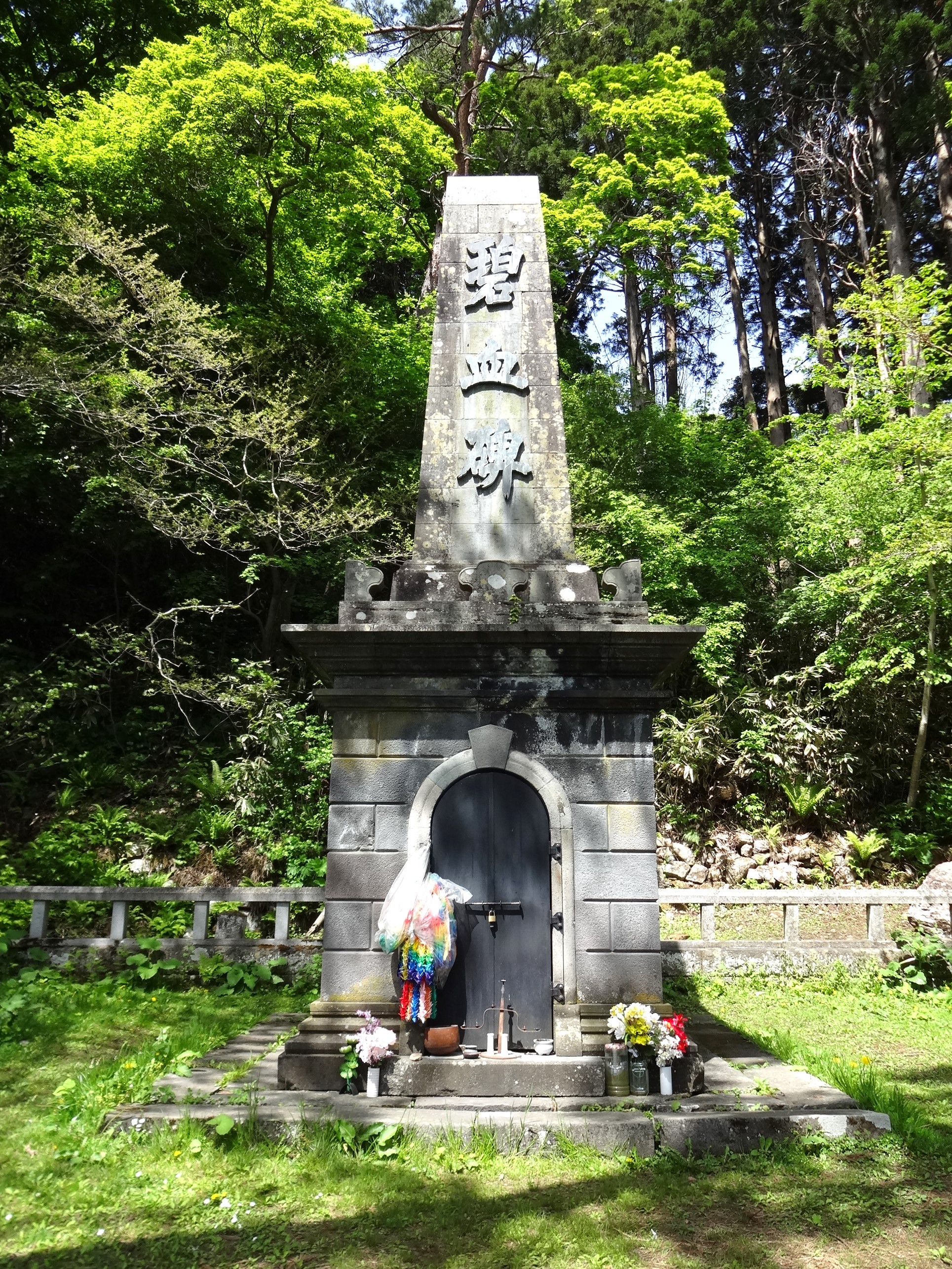 「箱館戦争で戦死した土方歳三や中島三郎助父子をはじめ、北関東から東北各地での旧幕府脱走軍戦死者の霊を弔っているのが、この碧血碑である。碑石は、7回忌にあたる明治8(1875)年、大鳥圭介や榎本式場らの協賛を得て、東京から船で運ばれたもので、碑の題字は、戦争当時陸軍奉行であった大鳥圭介の書といわれている。 碑の台座裏に、碑建立の由来を示す16文字の漢字が刻まれているが、その表現からは、旧幕府脱走軍の霊を公然と弔うには支障があったことが推測される。 なお、碧血とは「義に殉じて流した武人の血は3年たつと碧色になる」という、中国の故事によるものである。」