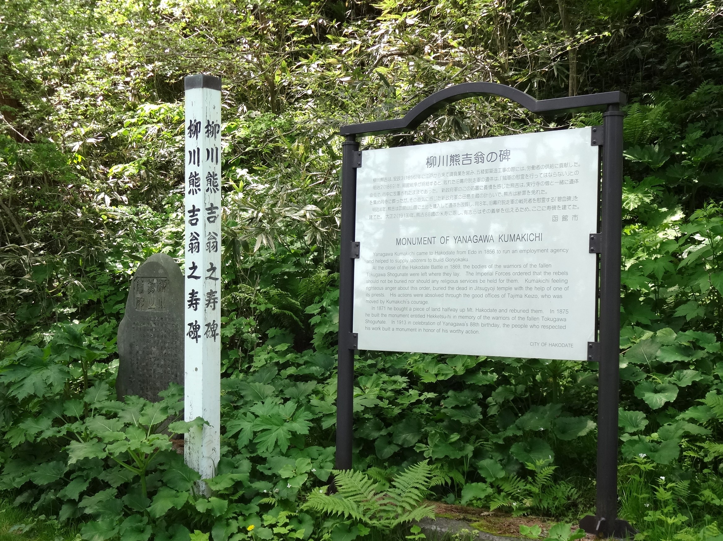 函館八幡宮の社殿の横の舗装された道を上り坂のほうへ案内板に従って歩いた、山の中腹にある。旧幕府軍戦死者の埋葬に尽力した柳川熊吉の顕彰碑や、明治初期の外交官・宮本小一が碧血碑を詠んだ漢詩の碑が建立されている。