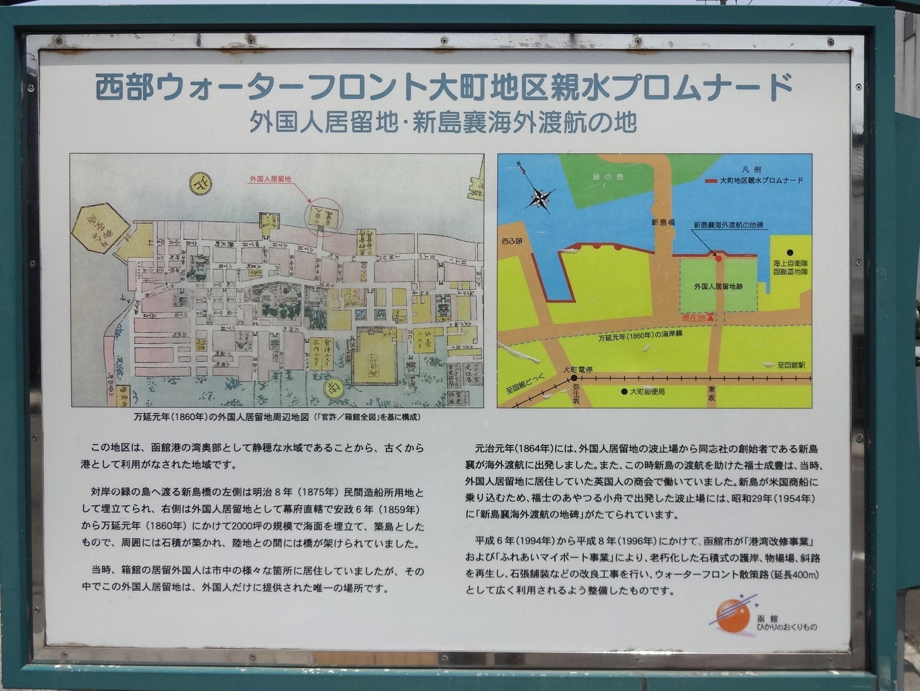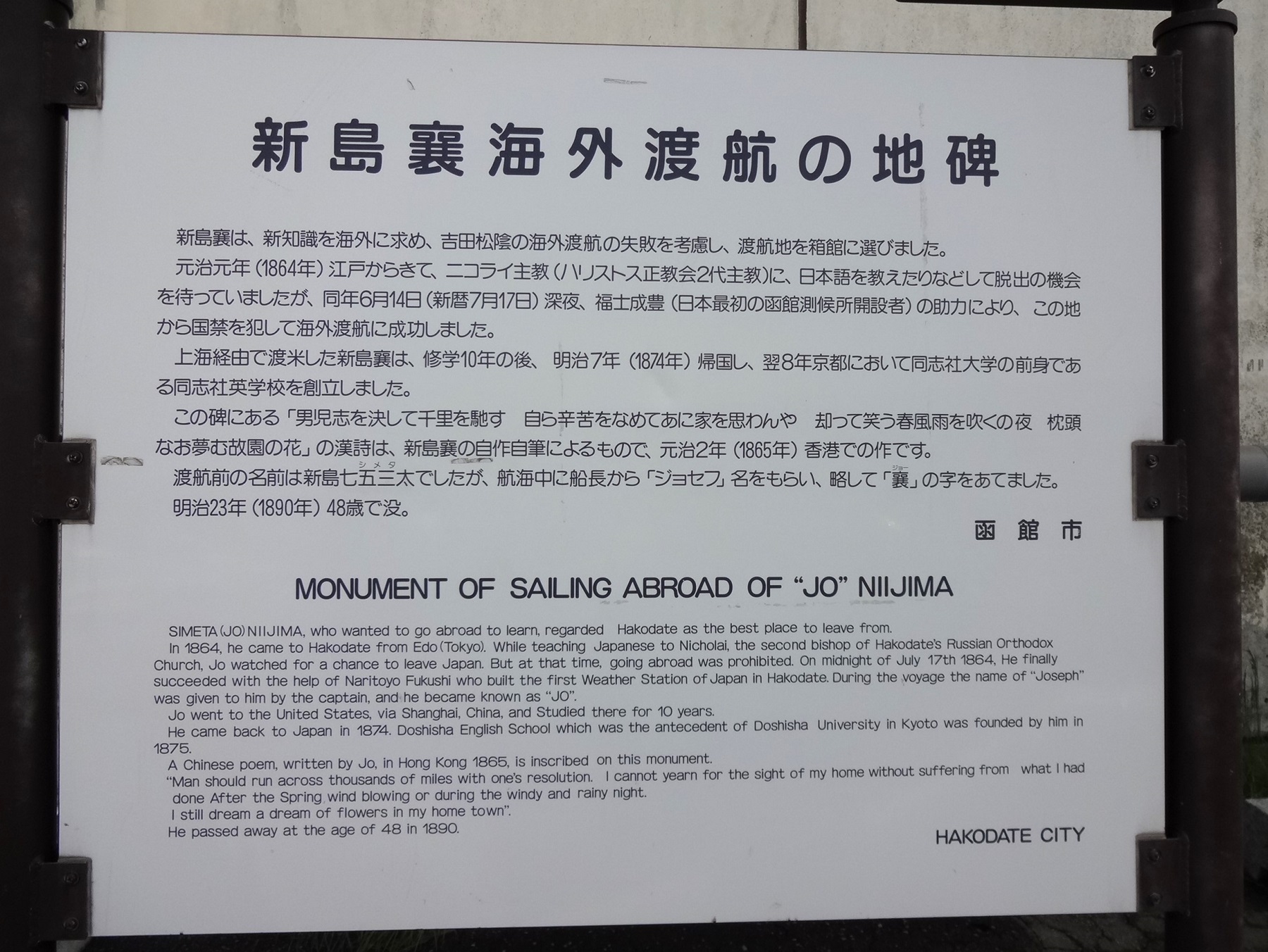 「新島襄は、新知識を海外に求め、吉田松陰の海外渡航の失敗を考慮し、渡航地を箱館に選びました。 元治元年(1864年)江戸からきて、ニコライ主教(ハリストス正教会2代主教)に、日本語を教えたりなどして脱出の機会を待っていましたが、同年6月14日(新暦7月17日)深夜、福士成豊(日本最初の函館測候所開設者)の助力により、この地から国禁を犯して海外渡航に成功しました。 上海経由で渡米した新島襄は、修学10年の後、明治7年(1874年)帰国し、翌8年京都において同志社大学の前身である同志社英学校を創立しました。 この碑にある「男児志を決して千里を馳す 自ら辛苦をなめてあに家を思わんや 帰って笑う春風雨を吹くの夜 枕頭なお夢む故園の花」の漢詩は、新島襄の自作自筆によるもので、元治2年(1865年)香港での作です。 渡航前の名前は新島七五三太でしたが、渡航中に船長から「ジョセフ」名をもらい、略して「襄」の字をあてました。 明治23年(1890年)48歳で没。」