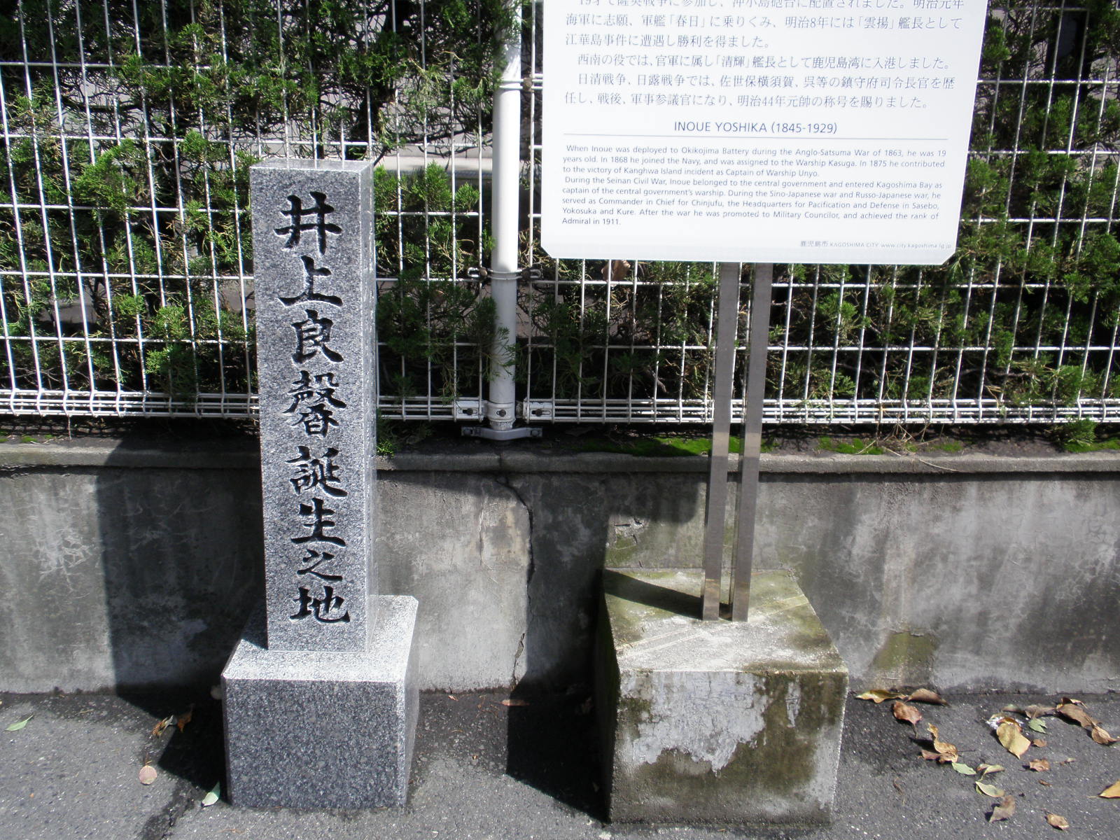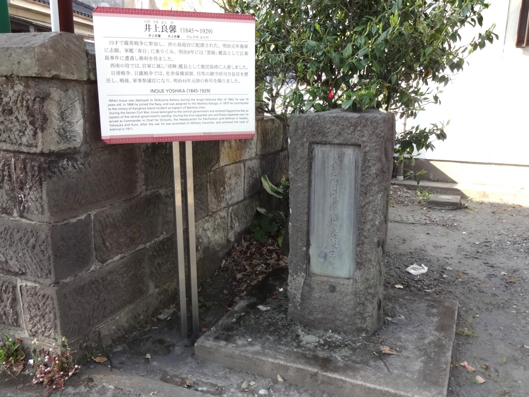 井上良馨誕生地碑は、高麗町と加治屋町の2ヶ所にある。高麗町にある石碑は昭和9年(1934年)建立で、石が風化しているので建立者は不明。加治屋町の石碑は加治屋町の町内会が昭和43年(1968年)に明治100年を記念して井上他約10人の碑を建立したときのもので、現在の碑は平成8年(1996年)に再建されたもの。誕生地としては高麗町のほうが正しいという。