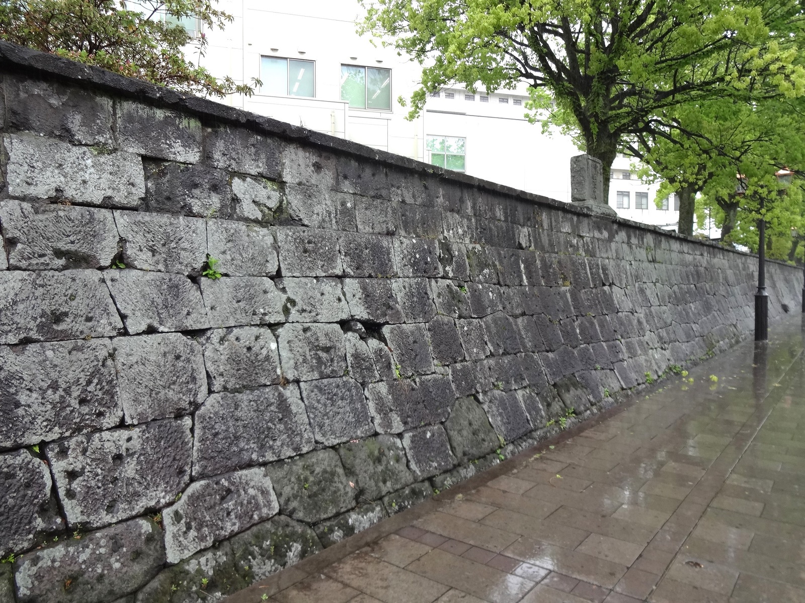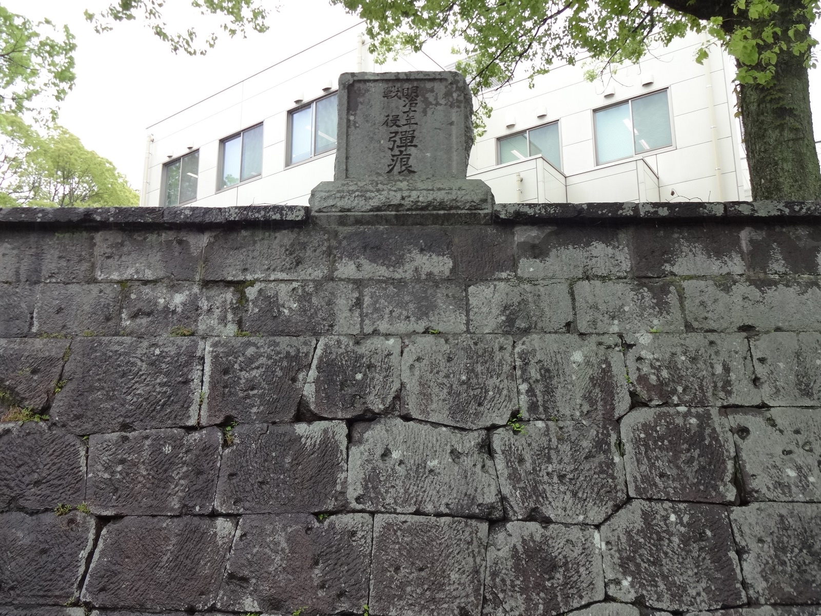 西郷隆盛が設立した私学校跡。石垣に西南戦争時の銃痕が残っている。