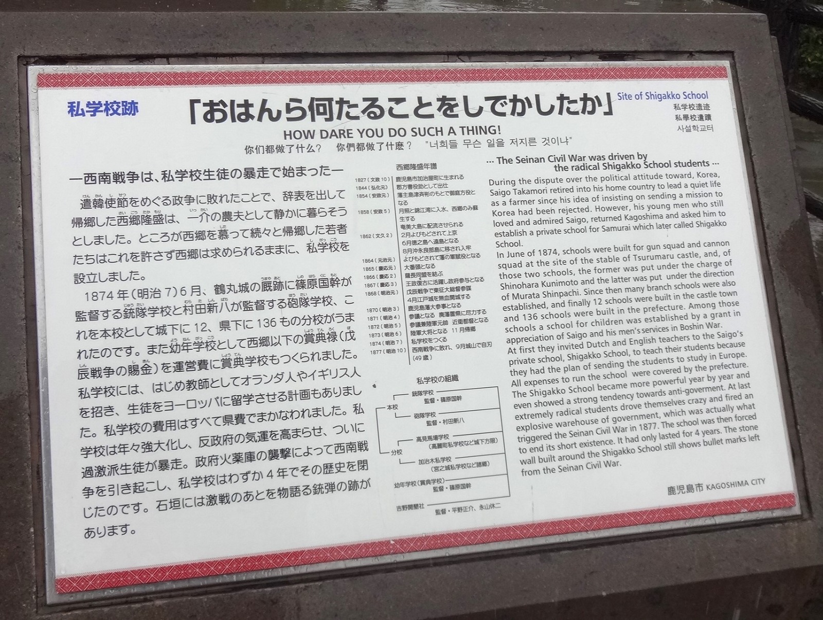 明治6年(1873年)遣韓使節をめぐる政争に敗れ、辞表を出して帰郷した西郷隆盛は、一介の農夫として静かに暮らそうとした。西郷を慕って続々と帰郷した若者達に求められるまま、明治7年(1874年)鶴丸城の厩跡に私学校を設立した。篠原国幹が監督する銃隊学校と村田新八が監督する砲隊学校を本校として、城下に城下に12,県下に136の分校がうまれた。私学校は年々強大化し、反政府の気運を高まらせ、過激派生徒が暴走。西南戦争を引き起こした。