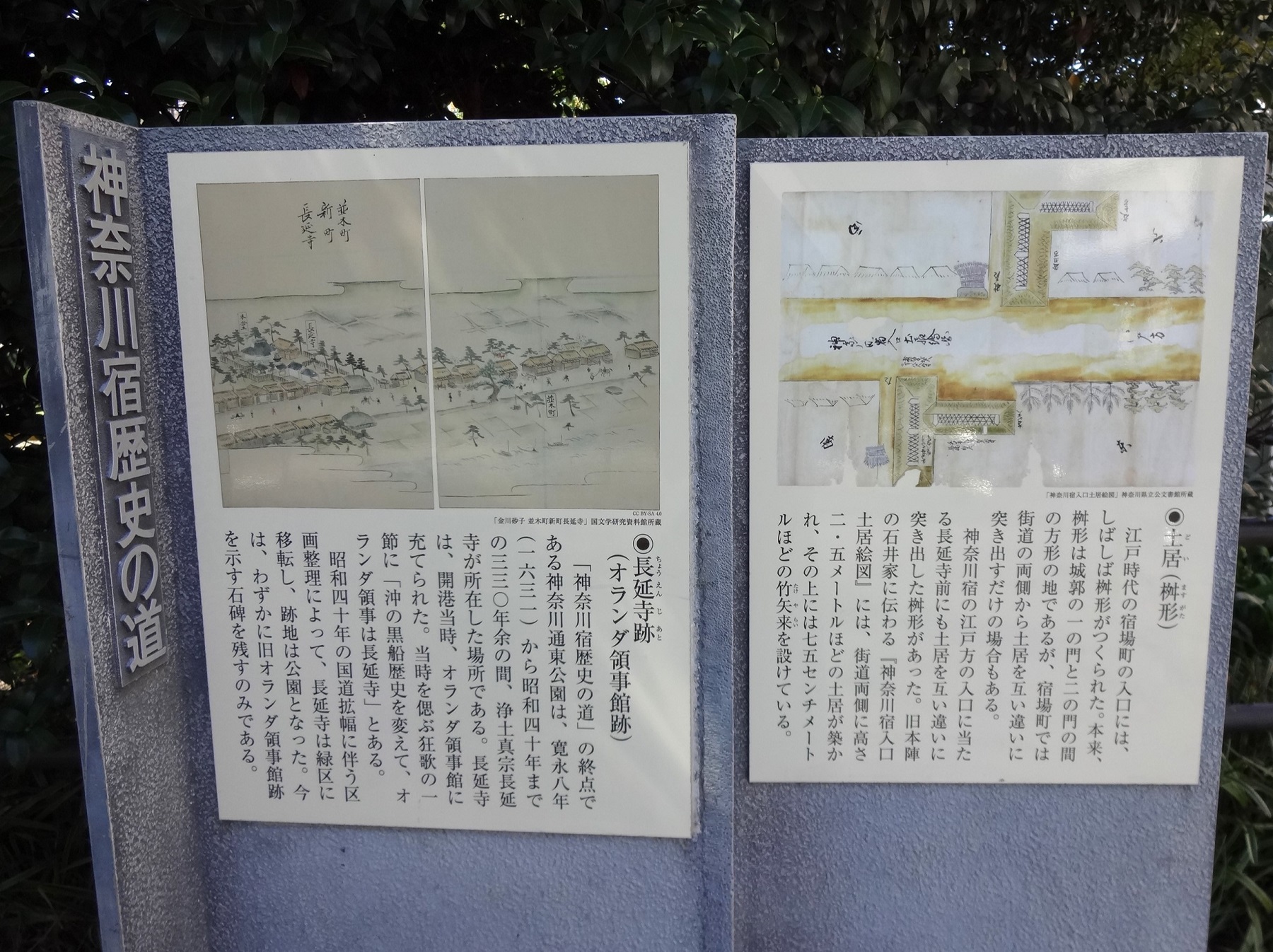「神奈川宿歴史の道」の終点である神奈川通東公園は、寛永8年(1631)から昭和40年までの330年余の間、浄土真宗長延寺が所在した場所である。長延寺は、開港当時、オランダ領事館に充てられた。当時を偲ぶ狂歌の一節に「沖の黒船歴史を変えて、オランダ領事は長延寺」とある。昭和40年の国道拡幅に伴う区画整理によって、長延寺は緑区に移転し、跡地は公園となった。今は、わずかに旧オランダ領事館跡を示す石碑を残すのみである。