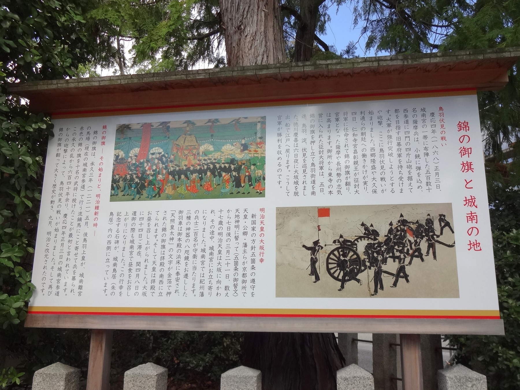 ここ城南宮から、明治維新を決定づける戊辰戦争の発端となった鳥羽伏見の戦いが始まった。慶応3年(1867)12月9日の王政復古の大号令で幕府は廃され、前将軍徳川慶喜は12日に京都の二条城から大坂に退いた。しかし、新政府側の薩摩藩の行為に憤激し、慶応4年正月2日、旧幕府兵および会津・桑名両藩の兵からなる大軍が大坂から京に向かった。これに対し朝廷では、薩摩、長州、土佐等諸藩の兵を鳥羽と伏見に繰出し鳥羽では城南宮から鳥羽街道の小枝橋に至る参道に、伏見では御香宮神社付近に陣を構えた。翌1月3日、都を目指し鳥羽街道を北上する旧幕府軍はここ城南宮から南南西500メートルの地点に達し、入京を阻止する薩摩郡と長時間対峙した。夕闇が迫り強行突破の構えを見せるや、城南宮の参道に置かれた薩摩軍の大砲が轟き、続いて伏見でも両軍が衝突、激戦となった。4日も下鳥羽から伏見にかけて戦闘が続いたが、仁和寺宮彰親王が錦の御旗を奉じて御所を出陣との報が伝わり、官軍となった新政府軍の士気は大いに高まった。5日、錦の御旗は鳥羽街道を南に進み、旧幕軍は淀、八幡へ退却、新政府軍の勝利が決定的となった。こうして新しい時代が始まったのである。