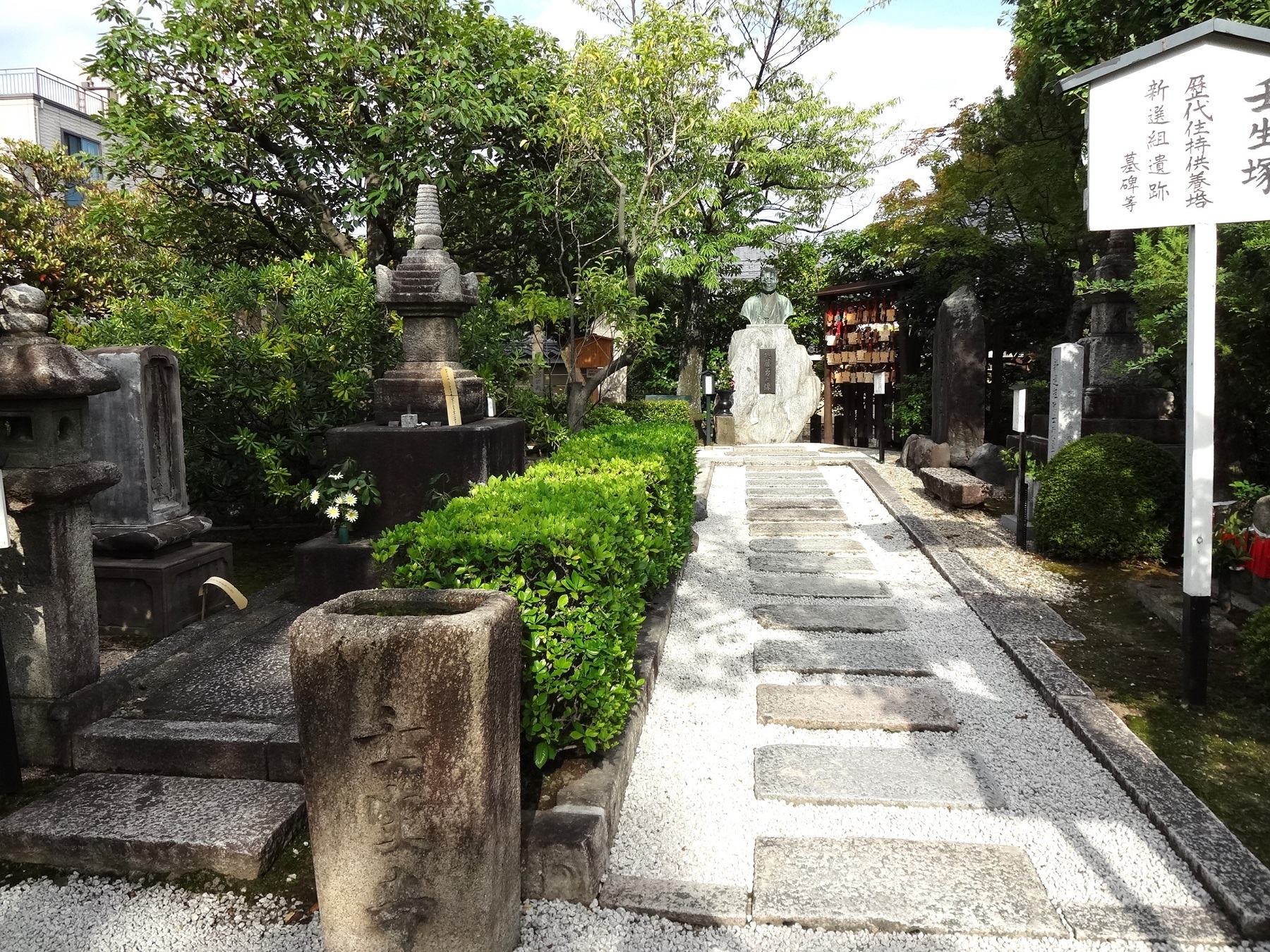 境内には壬生塚と呼ばれる一角があり、近藤勇の胸像と遺髪塔、新選組屯所で暗殺された芹沢鴨と平山五郎の墓、勘定方・河合耆三郎の墓など、新選組隊士11名の墓がある。