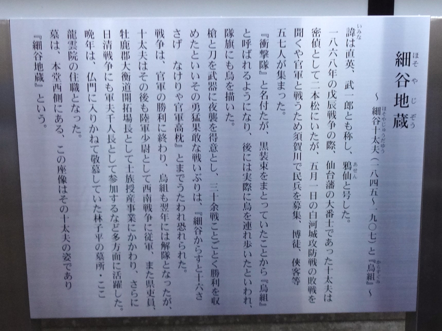 衝撃隊は黒装束を纏っていたことから「烏組(カラス組)」とも呼ばれた。仙台藩が新政府軍に降伏すると、烏組も解隊となる。細谷十太夫はその後、陸軍少尉として西南戦争に参加、士族授産事業に関わり、日清戦争にも軍夫千人長として参加した。