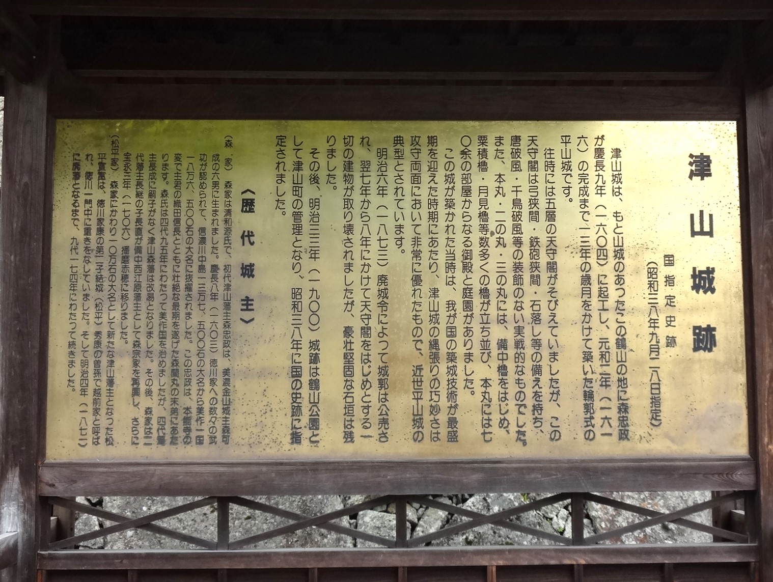嘉吉元年 (1441年)山名忠政が津山城のある鶴山に城を築いたのがはじまり。関ヶ原の戦い後には岡山藩主だった小早川秀秋の領地になったが、小早川家も廃絶すると、慶長8年(1603年)に森蘭丸の弟・森忠政が入封。津山藩初代藩主となり、現在の津山城の築城した。元禄10年(1697年)に森家が領地没収になると、翌年に松平家が藩主となり、幕末まで松平氏の時代が続いた。明治6年(1873年)の廃城令で建物は取り壊され、石垣が現存。