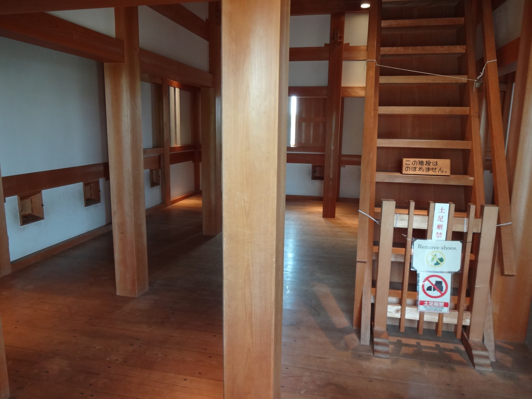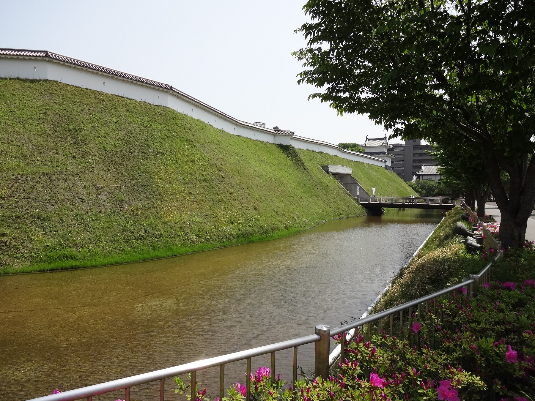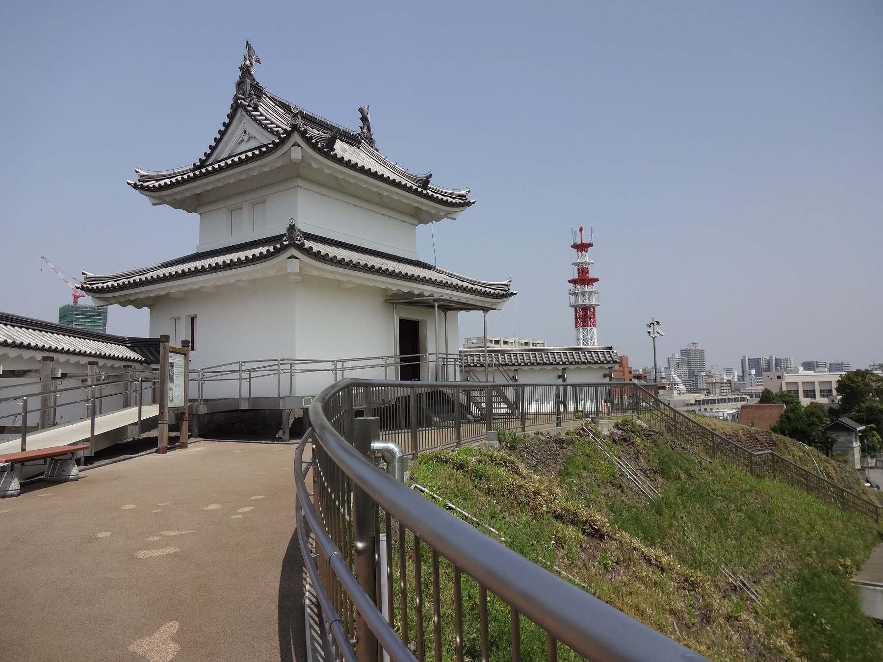 本丸土塁の一部、土塁上に建つ富士見櫓、清明台櫓などが復元されている。