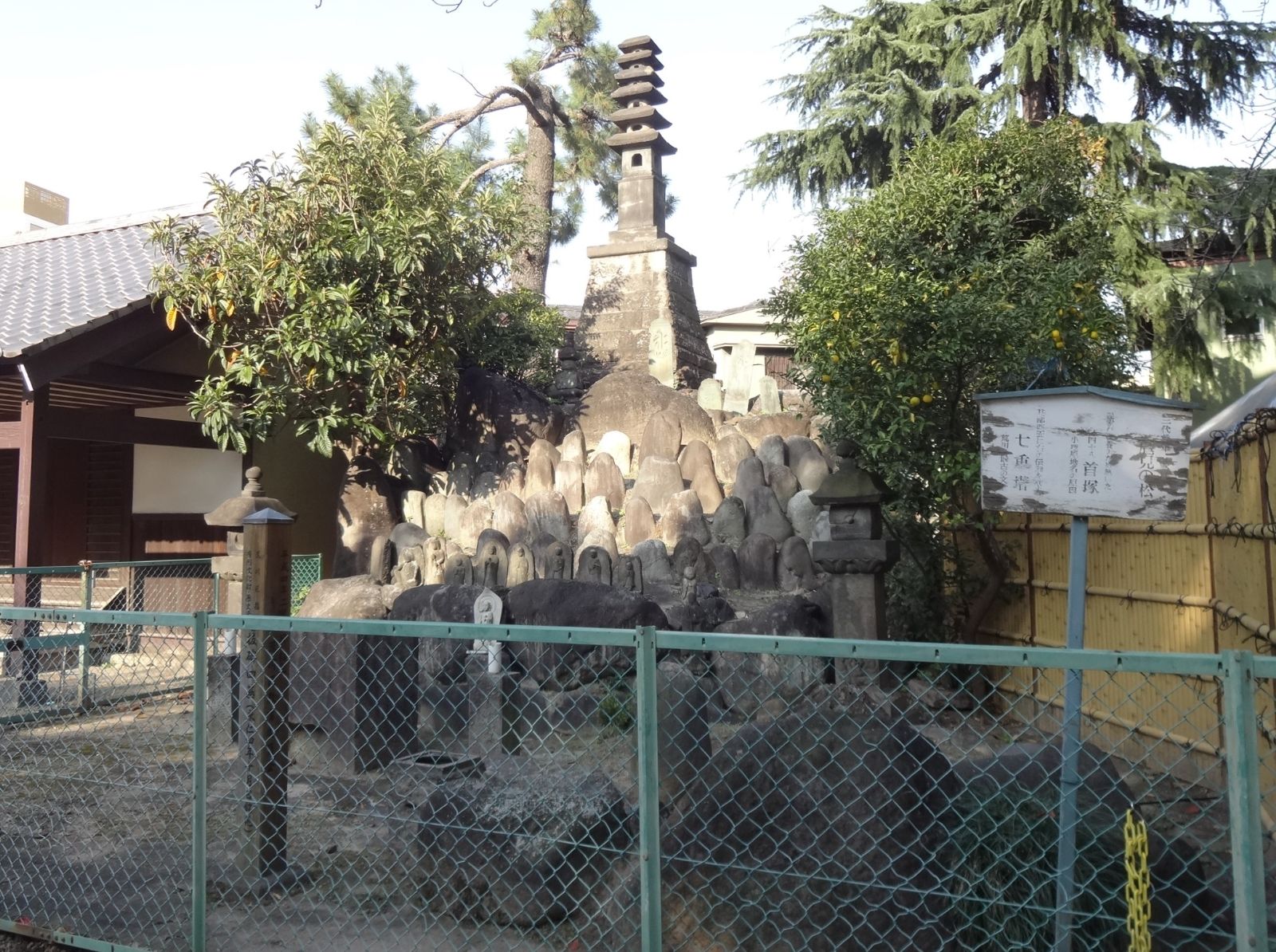 円通寺の由来が刻まれている永仁4年(1296年)建立の石造七重の塔がある。戊辰役の上野戦争の遺構として、寛永寺の山門(黒門)が保存されている。また、上野戦争で戦死した彰義隊隊士の墓、榎本武揚、大鳥圭介、高松凌雲、松平太郎、荒井郁之助ら戊辰戦争で旧幕府軍に属した人物の追弔碑がある。