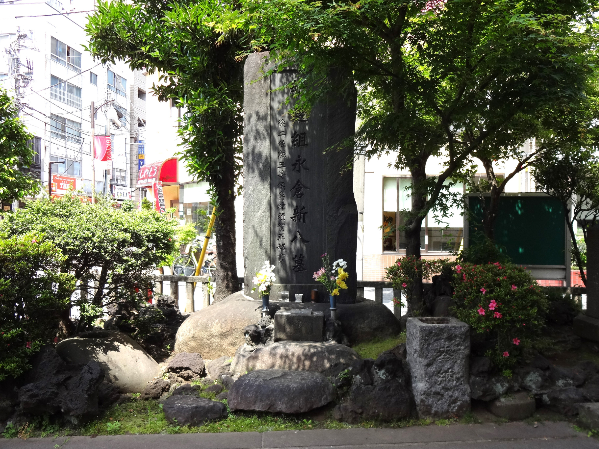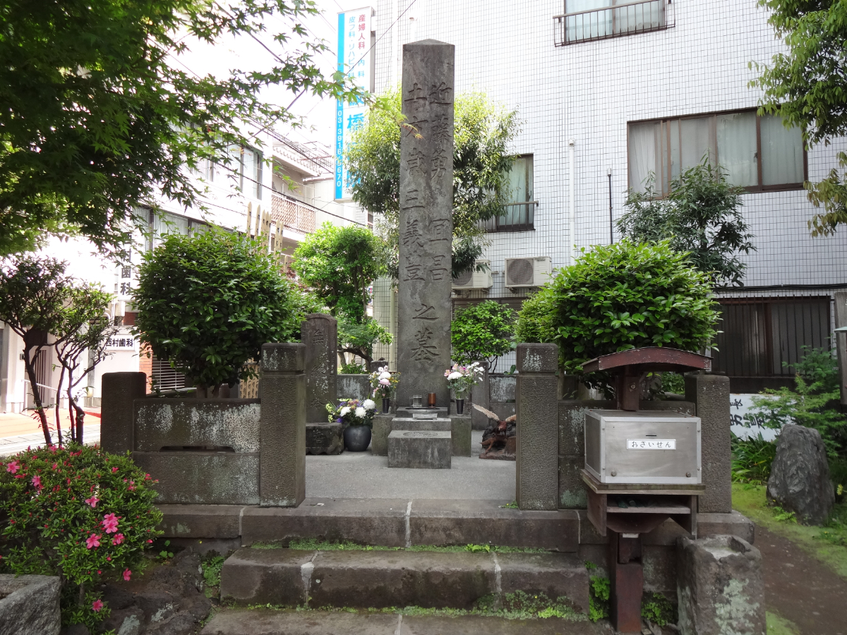 近藤勇と新選組隊士供養塔:慶応4年(1868)4月25日、新選組局長であった近藤勇は、中山道板橋宿手前の平尾一里塚付近に設けられた刑場で官軍により斬首処刑されました。その後、首級は京都に送られ胴体は刑場より少し離れたこの場所に埋葬されました。本供養塔は没後の明治9年(1876)5月に隊士の一人であり近藤に私淑していた永倉(本名長倉)新八が発起人となり旧幕府御典医であった松本良順の協力を得て造立されました。高さ3.6メートル程ある独特の細長い角柱状で、四面の全てにわたり銘文が見られます。正面には、「近藤勇 冝昌 土方歳三義豊 之墓」と刻まれており、副長の土方歳三の名も近藤勇の右に併記されています。なお、近藤勇の諱である昌宜が冝昌とされていることについては明らかになっておりません。右側面と左側面には、それぞれ八段にわたり井上源三郎を筆頭に合計百十名の隊士などの名前が刻まれています。裏面には、当初は「近藤 明治元年辰四月廿五日 土方 明治二年巳五月十一日 発起人 旧新選組長倉新八改杦村義衛 石工 牛込馬場下横町平田四郎右衛門」と刻まれていましたが、一部は現在判りにくくなっています。戦術方針の相違から一度は近藤と袂を分かった永倉ですが、晩年は戦友を弔う日々を送ったと伝えられています。本供養塔には、近藤勇のほか数多くの新選組ゆかりの者たちが祀られているので、新選組研究を行う際の基本資料とされ、学術性も高く貴重な文化財です。