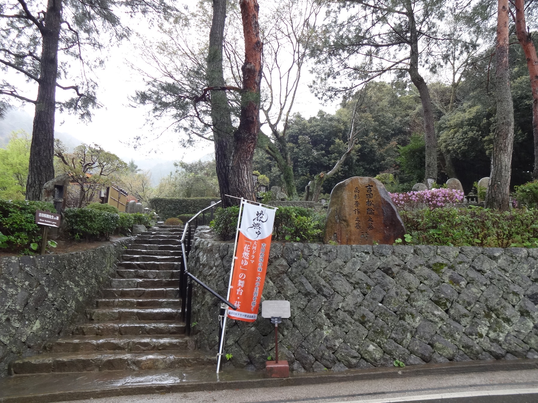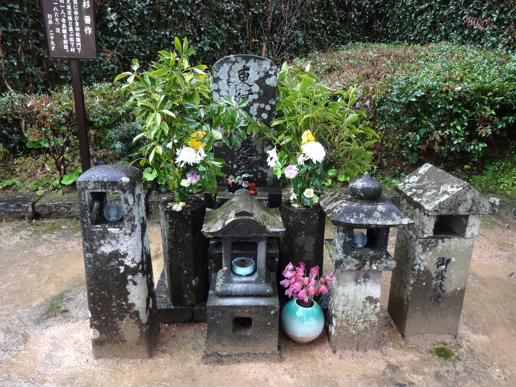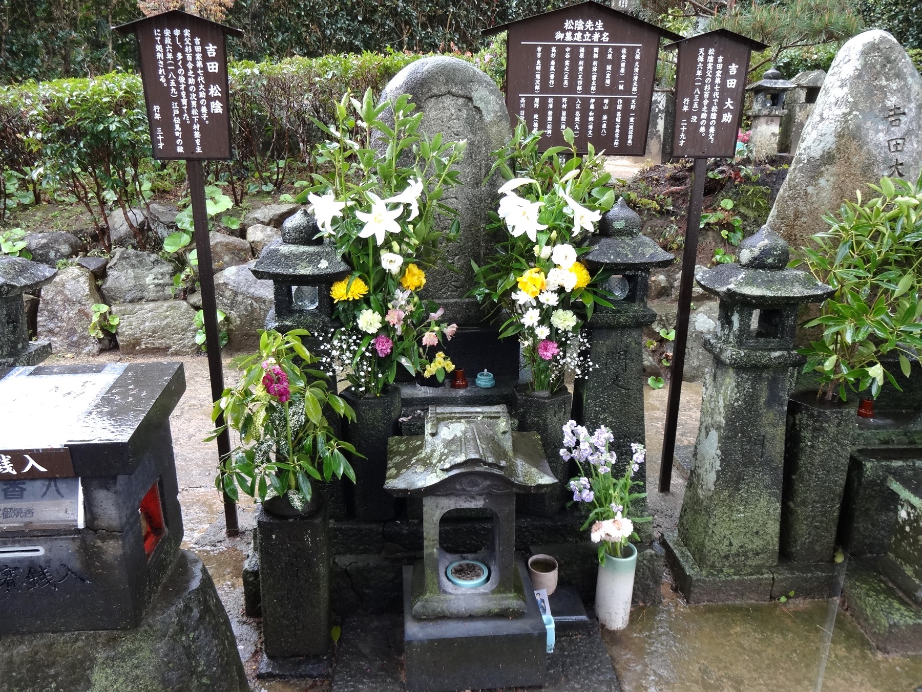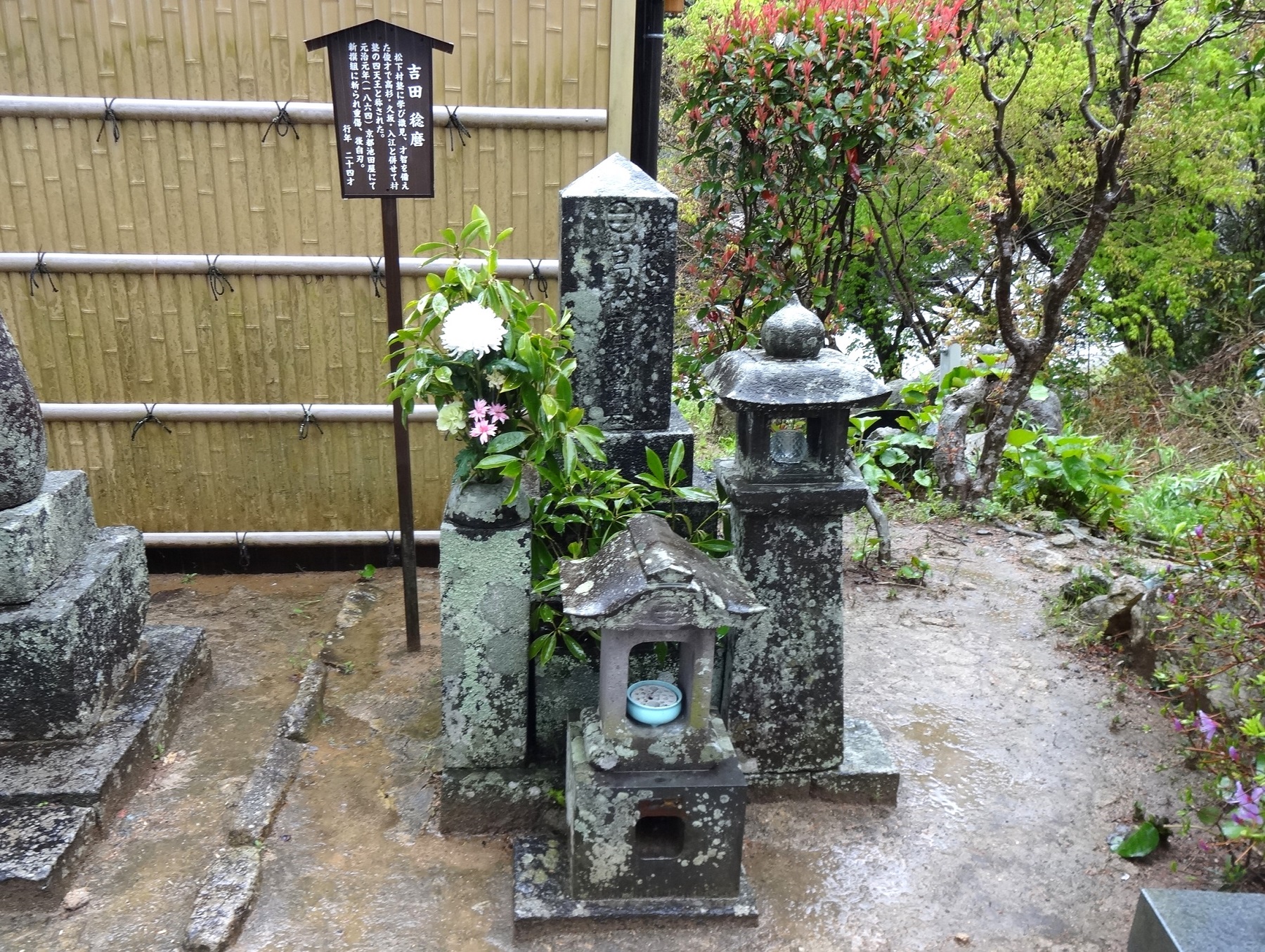 墓前の水盤や花立は、前原一誠や久坂玄瑞、高杉晋作、入江九一ら門人17人と妹たちが名前入りで寄進したもの。