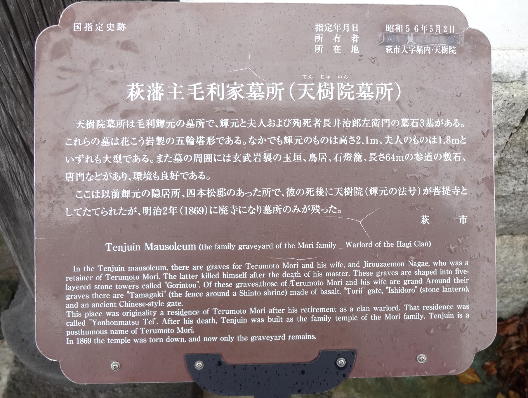 長州藩(萩藩)藩祖・毛利輝元の墓所がある。